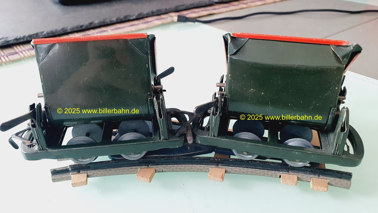 Kipplore, Plastik, Fahrgestell aus Metall, dunkelgrün, Lore rot, ohne Nummerierung wie links, Fahrgestell jetzt aus schwarzem Plastik