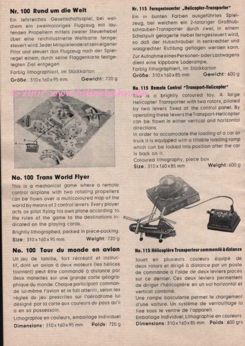 Erscheint in der 1959er Preisliste Katalog als 115 - ist also schon früher auf dem Markt gewesen. Die unten auf das Blättchen gestempelte Nummer P.A. 138 690 (vielleicht Patent angemeldet ???) mit dem Datum 06.03.1956 kann Anhand meiner Unterlagen nicht nachvollzogen werden. Eventuell wurde hier kein Patent erteilt, weil es sich im Wesentlichen um den Trans World Flyer handelt - und hier wurde ein Patent erteilt (siehe auch beim 100 TWF). Das würde auch erklären weshalb die 1. Version des Hubschraubärs anfänglich mit der Basis des TWF angepriesen und ausgeliefert wurde. 110 Neuheit Anfang 1956 - im Programm bis ??? 115 Neuheit 1958 ??? - im Programm bis mindestens 1965 Größe: 310 x 160 x 85mm |