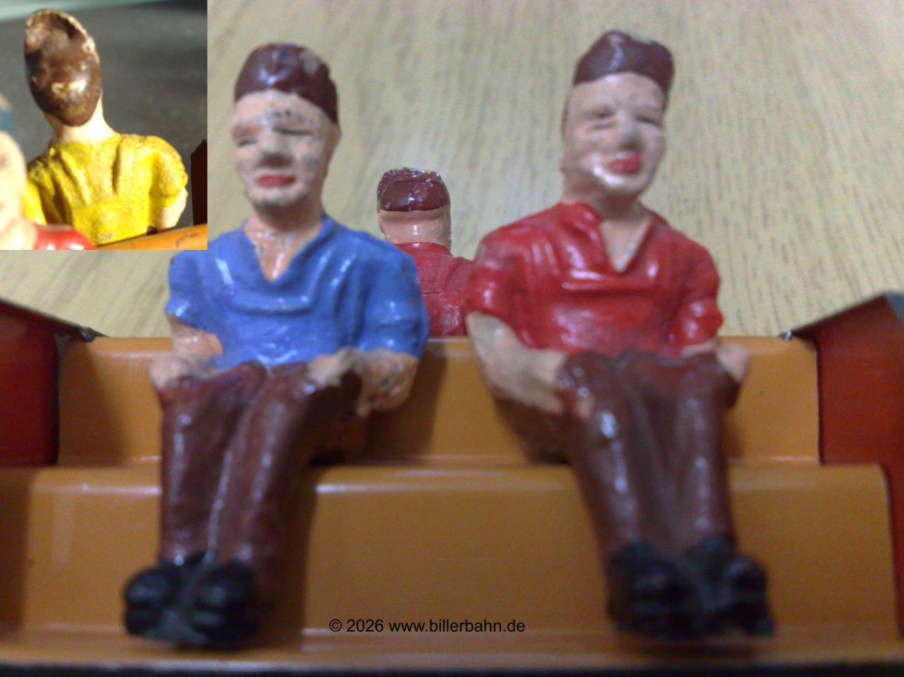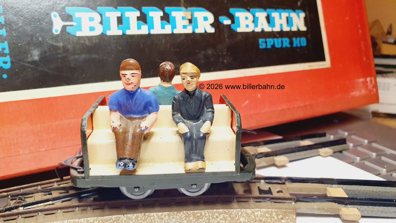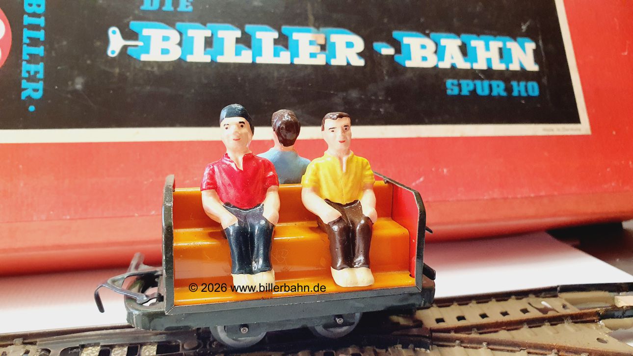 | Figuren der ersten Serie mit Hosenträgern auf orangefarbener Sitzbank. Der Wagen mit grünem Chassis. | Figuren der 2. Serie ohne Hosenträger auf orangefarbener Sitzbank. Der Wagen mit rotem Chassis. | ||