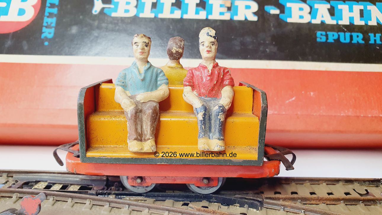 | orangefarbene Sitzbank mit Plastik-Figuren ohne Hosenträger. Der Wagen mit grünem Chassis. | 4 Farben der Sitzbänke auf grünem Chassis: 4 Beige, Orange, Dunkel- und Hellbraun |