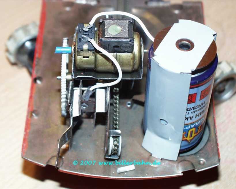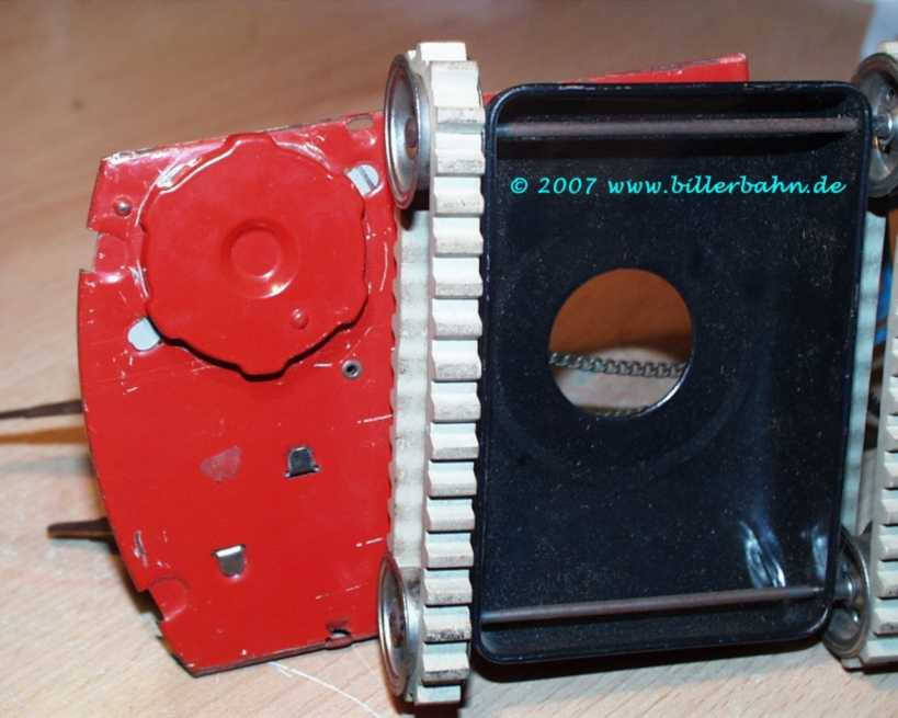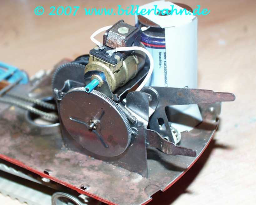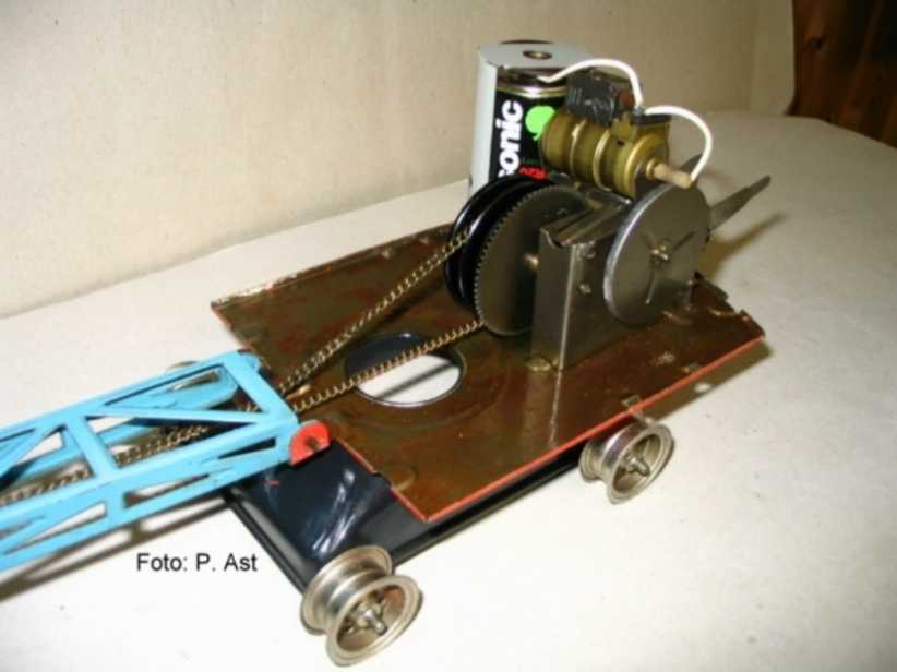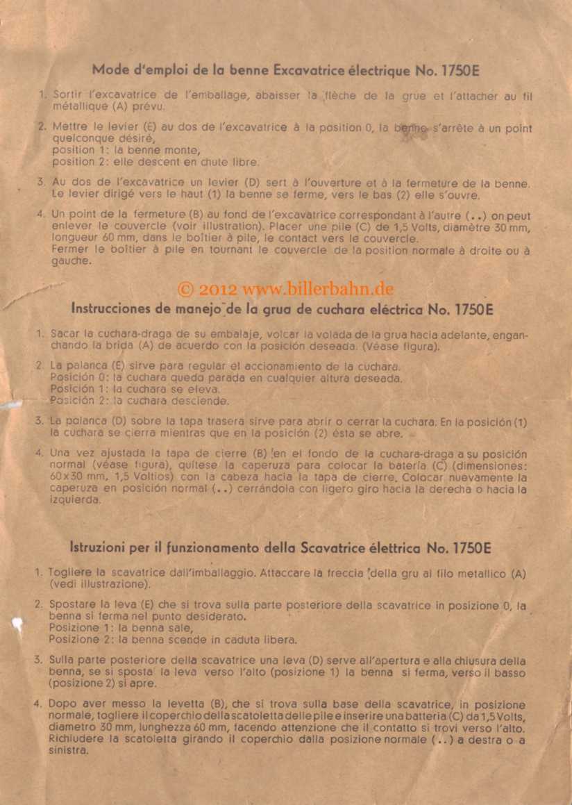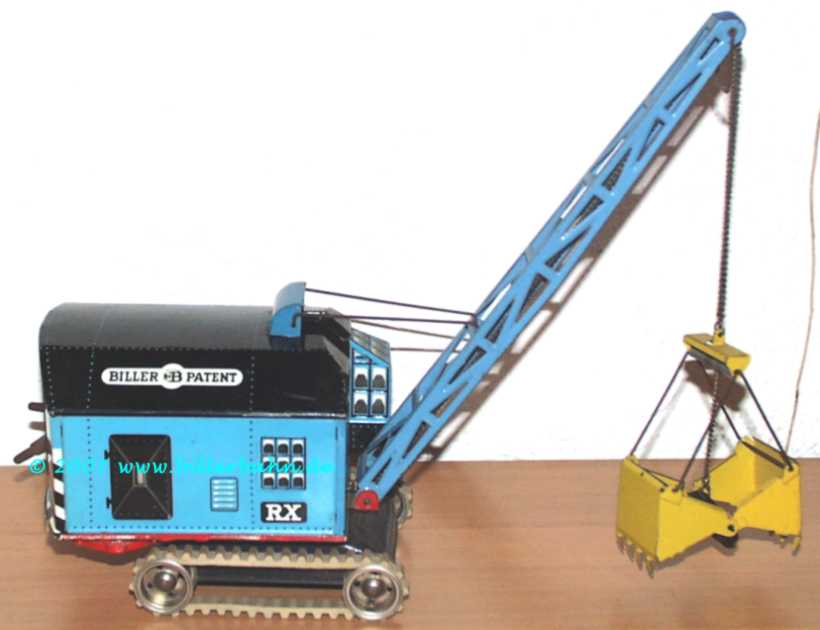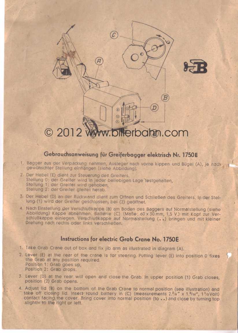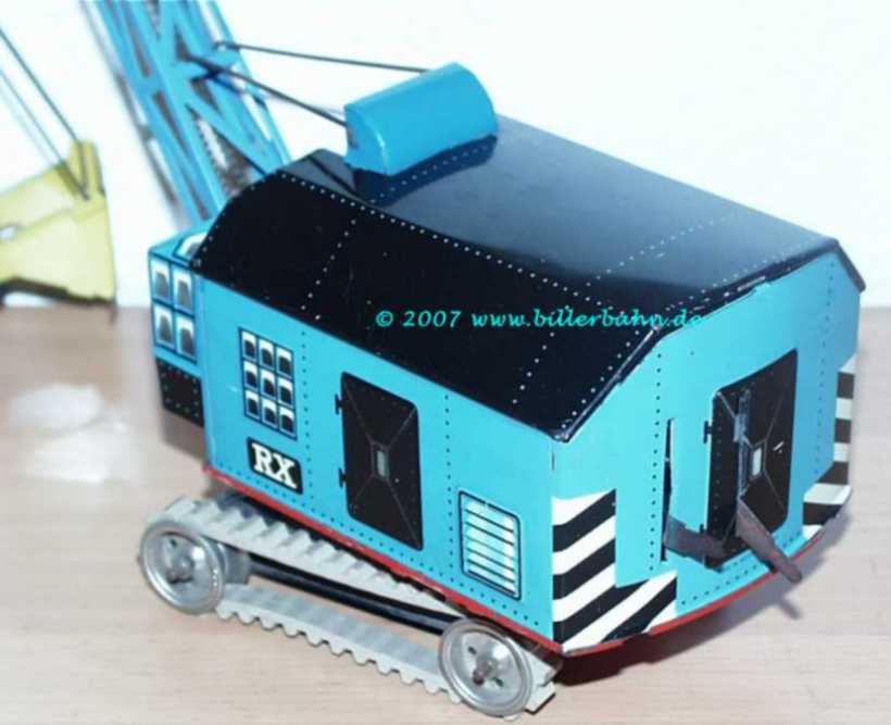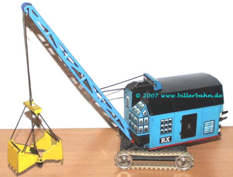 Twin-axle clockwork-excavator. Light-blue. Chassis and roof are black, the small boom is light blue and the clam yellowish. Battery compartment for 1 x 1,5 Volt mono cell - accessible from underneath the red base tin. Contrary to the large 750 clockwork excavator this version can only lift the clam by power - and just drop it by disconnecting the motor shaft from the chain barrel - left lever in UP position. MIDDLE position of the lever lets the "crew" have a break - and LOW position connects the rubber coated motor shaft to the chain barrel again, closes an electrical contact and lifts the clam. Levers are known to have either red or yellow plastic caps - the lid for the battery compartment was either red or blank. Right lever on the cabin's rear side opens and closes the clam. This version of excavator appears as 1750 E in the 1959 and 1960 price lists and a "Specials" catalogue 1960 - and was announced as "same finish as article No. 745, but with electrical motor...". I don't have any further information. At this time the 745 was always shown as the multi-coloured excavator! Interesting! Was the electrical excavator available in other colors as well? My special gratitude to L. Kalden who "found" the according printing stamp. |