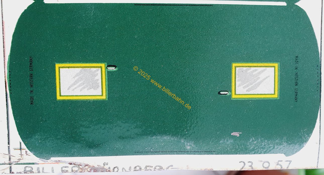 | Bogie coach, green, chassis of the 514, all tin - my estimate is a "assemblers mistake" or self-made | some models show grey foam material underneath the roof over the veranda - this was most probably installed to prevent injuries from the sharp roof corners. | ||||||||||||||||||||||||||||||||||