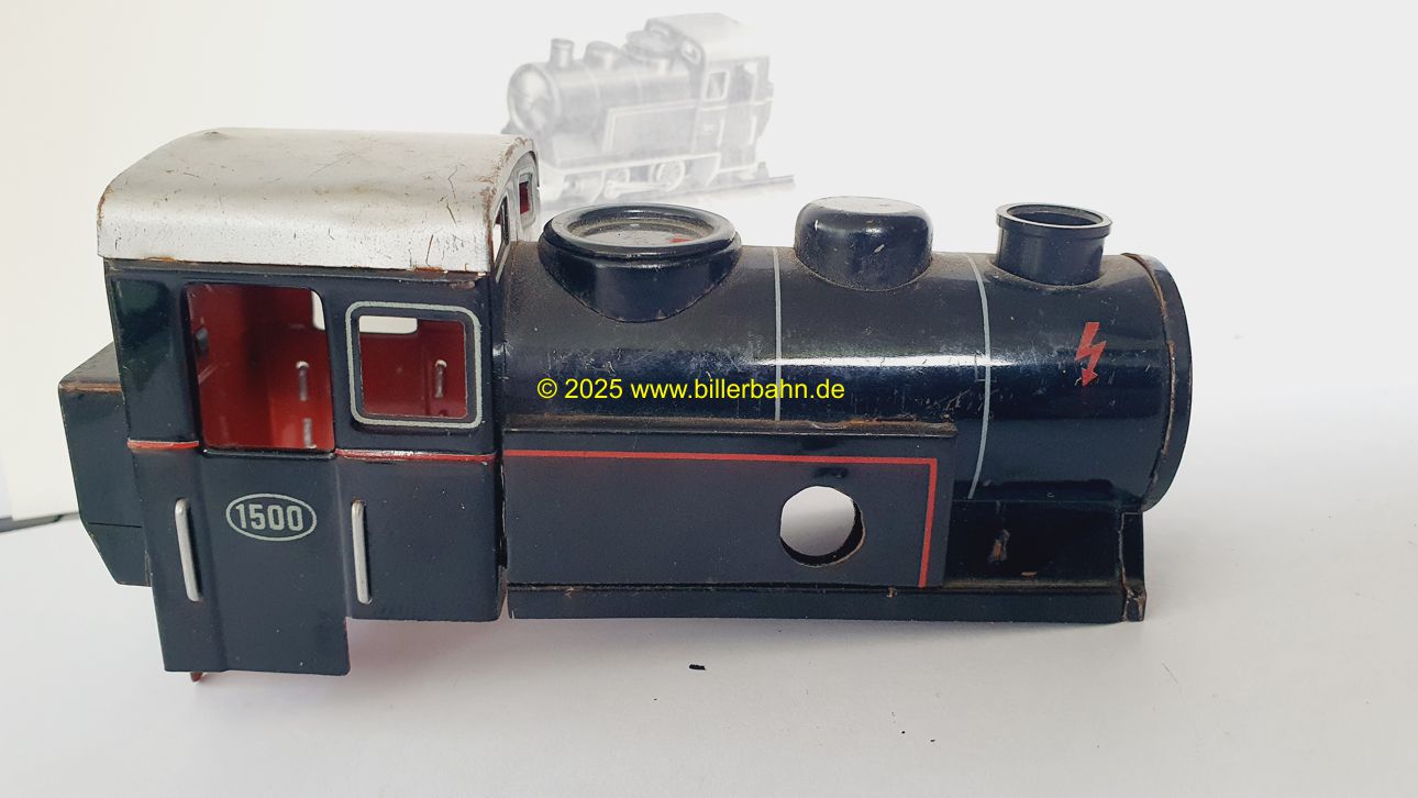 | Black superstructure, silver roof, red chassis and engine cover. Flat black switch. "1500" imprinted on both doors, a flash each side underneath the chimney. And the corresponding tender 1502. Novelty in 1956. By the way - all my 1500 have straight piston rods. | retailers journal "Das Spielzeug" - FEB 1956 - adverts Billerbahn as "now also electrical" | ||