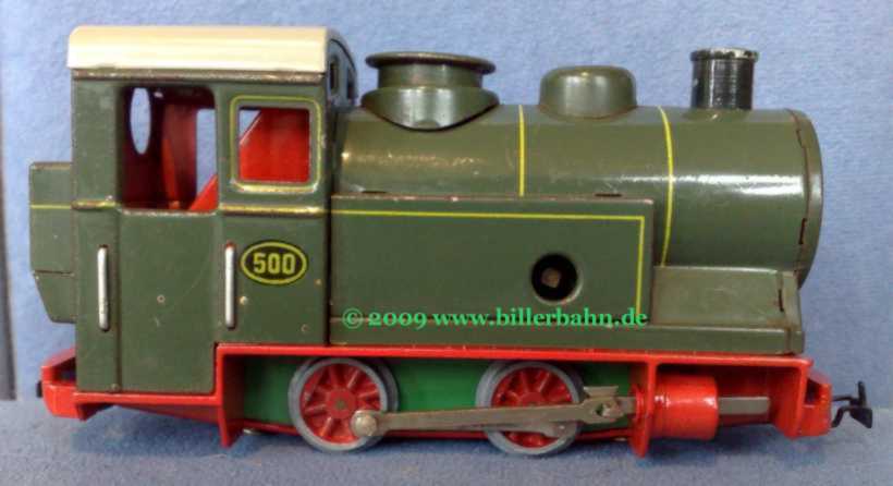 ... was a 500 equipped with two MÄRKLIN-couplings to be used as clockwork loco on MÄRKLIN layouts (see price list 1960). The body is green and the roof light grey - clockwork cover is bright green.