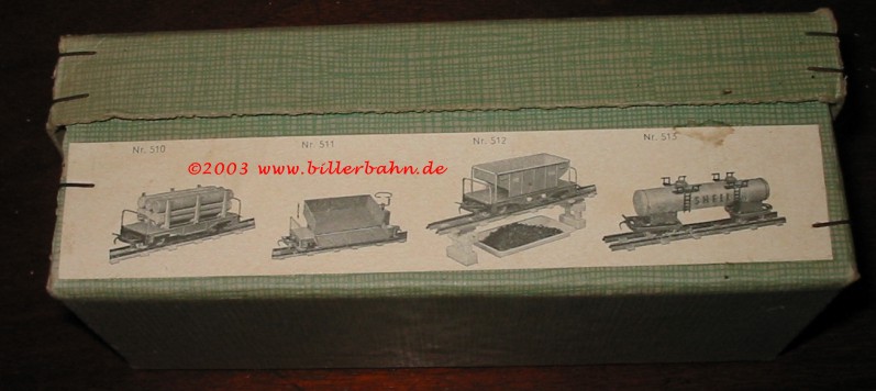 Most probably the first issues of boxes as of 1953 - left hand side a box for a single 4-axle wagon - middle and right showing a box for 4 x 506 track transporter, finally a box 6 tippers 001 |