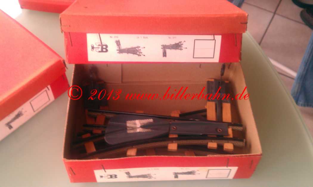 | An early 1960ies "multi-box". Two sides display the possible contents. The left picture shows the actual contents (520) incl. the price (amazing DEM 3,50) | Box (Z 4) for the switches in red | ||||||||||||||