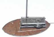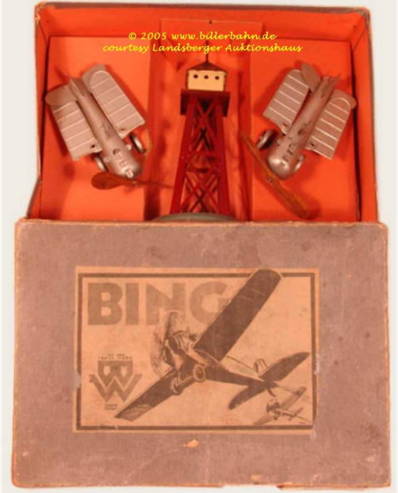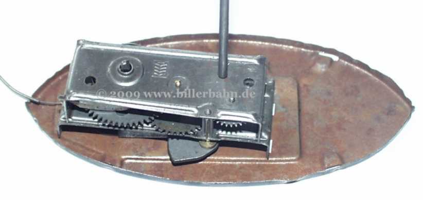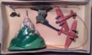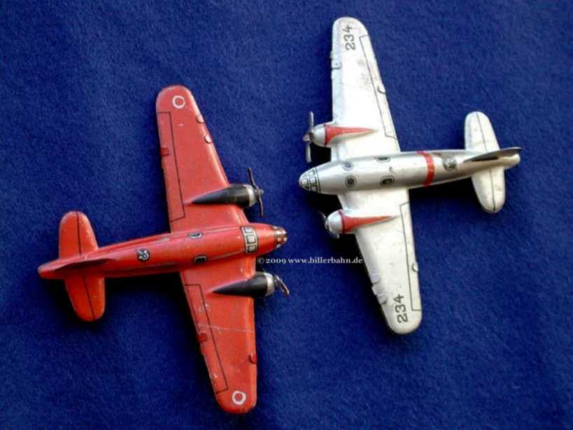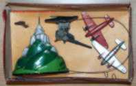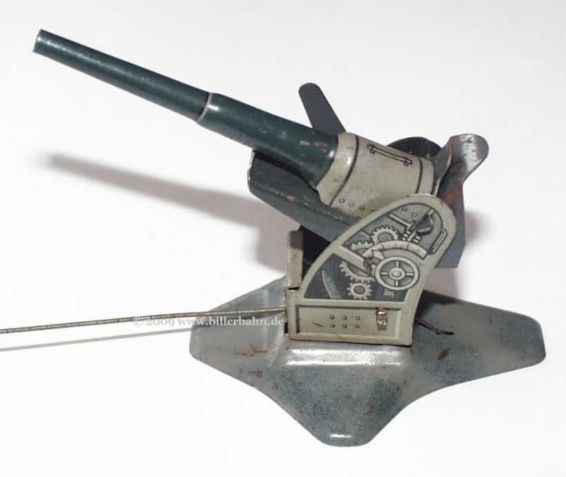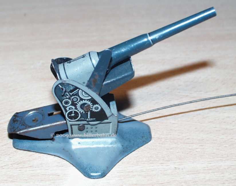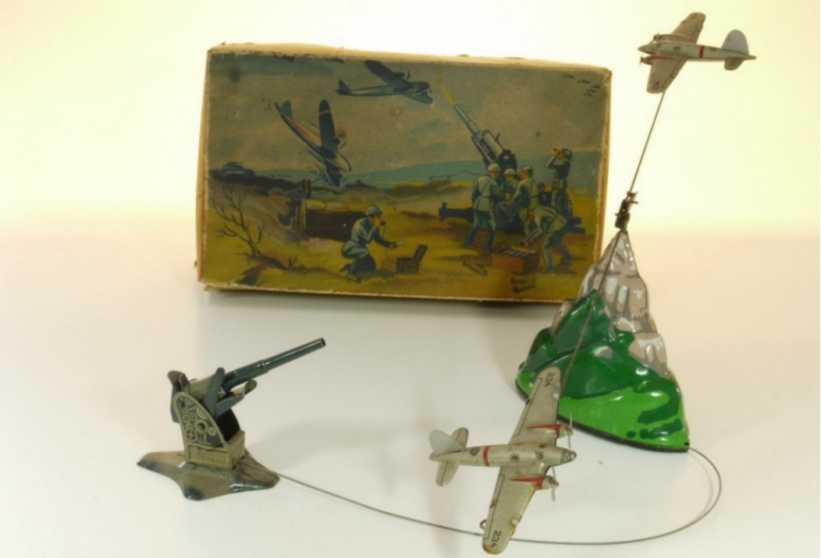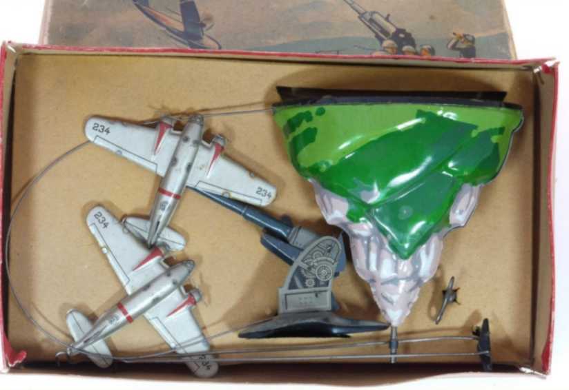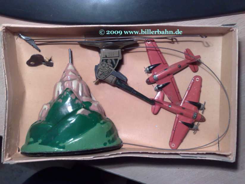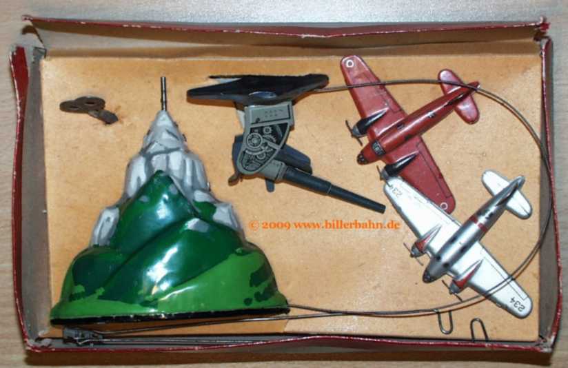 11.08 1938 bzw. 16.03.1939 patentieren. Hier wird das erste Bühler-Uhrwerk verwendet - die Spielzeuge vor 1938 haben ein Georg Grötsch (GGN) Uhrwerk. Auf den Berg wird ein Gestänge gesteckt, welches ungleich lange Stangen zur Aufnahme der beiden Flugzeuge hat. Um das Uhrwerk in Betrieb zu setzen, muss die Ladevorrichtung der Kanone "fertig geladen" werden, d.h. eine Ladeklappe, in die auch Amorces (Zündplättchen) eingelegt werden konnten, wird heruntergedrückt. Mit dem Herunterdrücken der Klappe wird mittels des Stahldrahtes/Bowdenzugs das Uhrwerk entriegelt. Das im Stillstand NICHT vorhandene Gleichgewicht wird mit Inbetriebnahme des Uhrwerks durch die Zentrifugalkraft ausgeglichen - beide Flugzeuge fliegen in etwa gleicher Höhe im Kreis. Betätigt man jetzt den Abschusshebel an der Kanone, schnellt die Klappe an der Kanone hoch und der Stahldraht verriegelt das Uhrwerk, dieses kommt zum Stillstand und eines der Flugzeuge "zum Niedergehen veranlasst wird, als ob es abgeschossen wäre". |