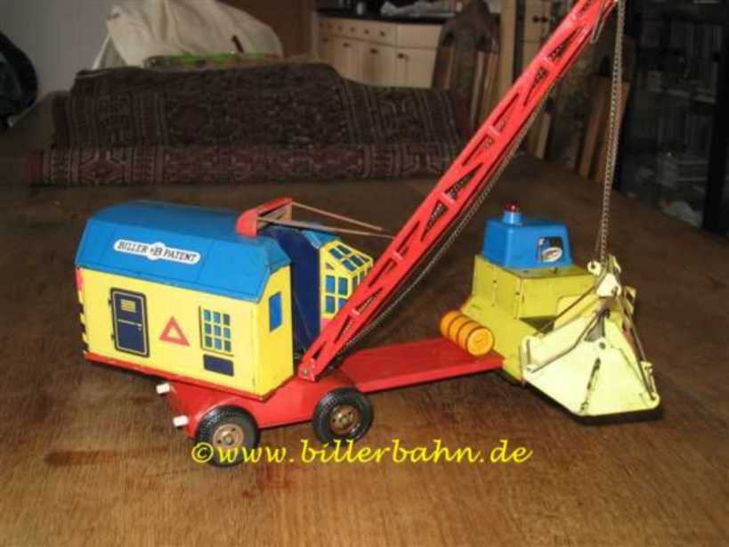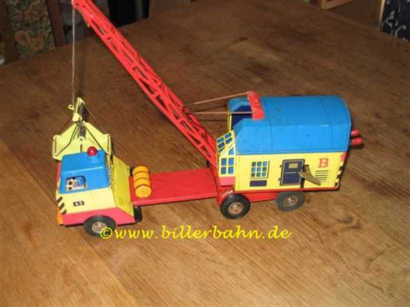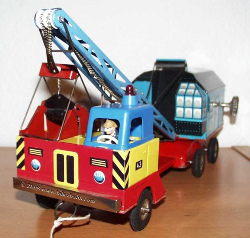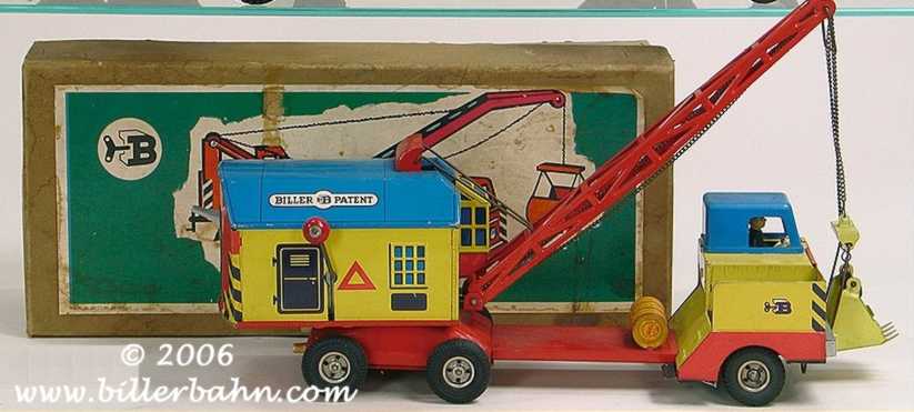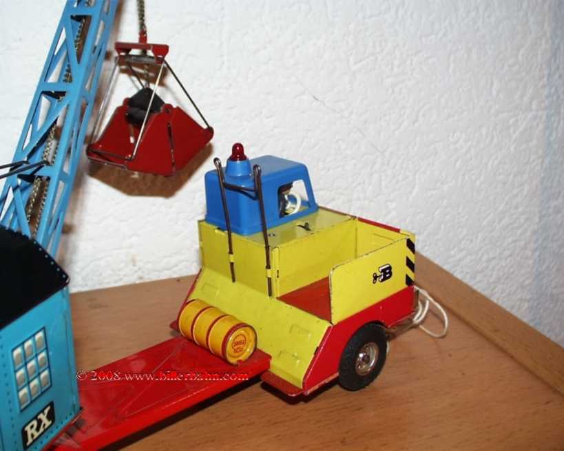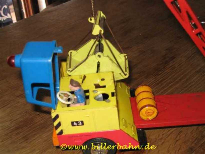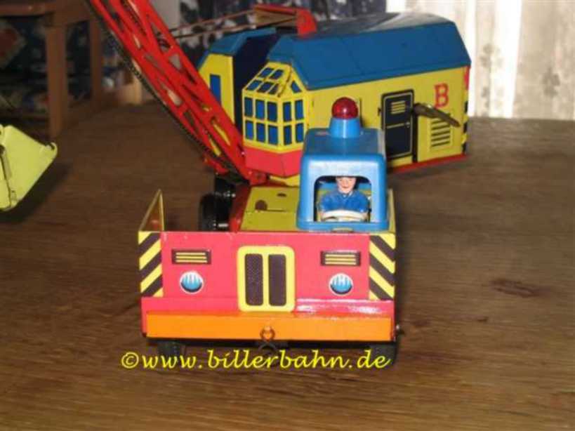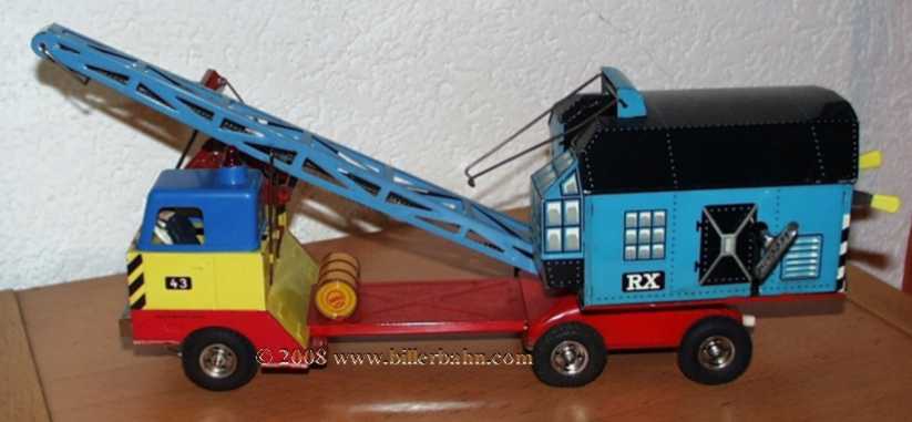 845 - dreiachsiger LKW mit Baggeraufbau vom 745 - 1. Der Kran wurde mittels Uhrwerk betrieben, der LKW hatte keinen Antrieb - musste also gezogen oder geschoben werden. Das Fahrerhaus des LKW war "halbiert", so dass die Schaufel in Fahrtrichtung rechts abgelegt werden konnte. Hinter der Kabine befindet sich eine Auslegerstütze, auf die der Ausleger platziert wurde. Auf dem Fahrerhaus war eine rotes Blinklicht angebracht, welches von einer Batterie gespeist wurde. Das Fahrgestell des LKW war Orange/ Rot, das Fahrerhaus, hinter dem ein Ölfass (wie beim Wagen 503) liegt, entweder Blau, Gelb oder Orange. Ob es diesen LKW auch ohne Blinklicht auf der Kabine als 845 gegeben hat, ist mir momentan noch nicht bekannt. Die hier verwendete Nummerierung habe ich aus der Preisliste 1959/60 und dem Spezialitätenkatalog 1960 abgeleitet. Und hier hat der blaue Bagger auch ein rotes Chassis. Dieser Bagger-LKW erscheint erstmals 1959 - und wird nicht als Neuheit vorgestellt. Maße: 400 x 135 x 160 mm |