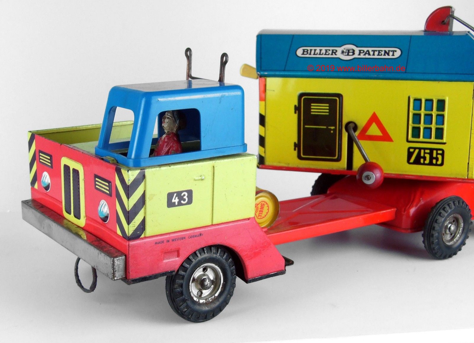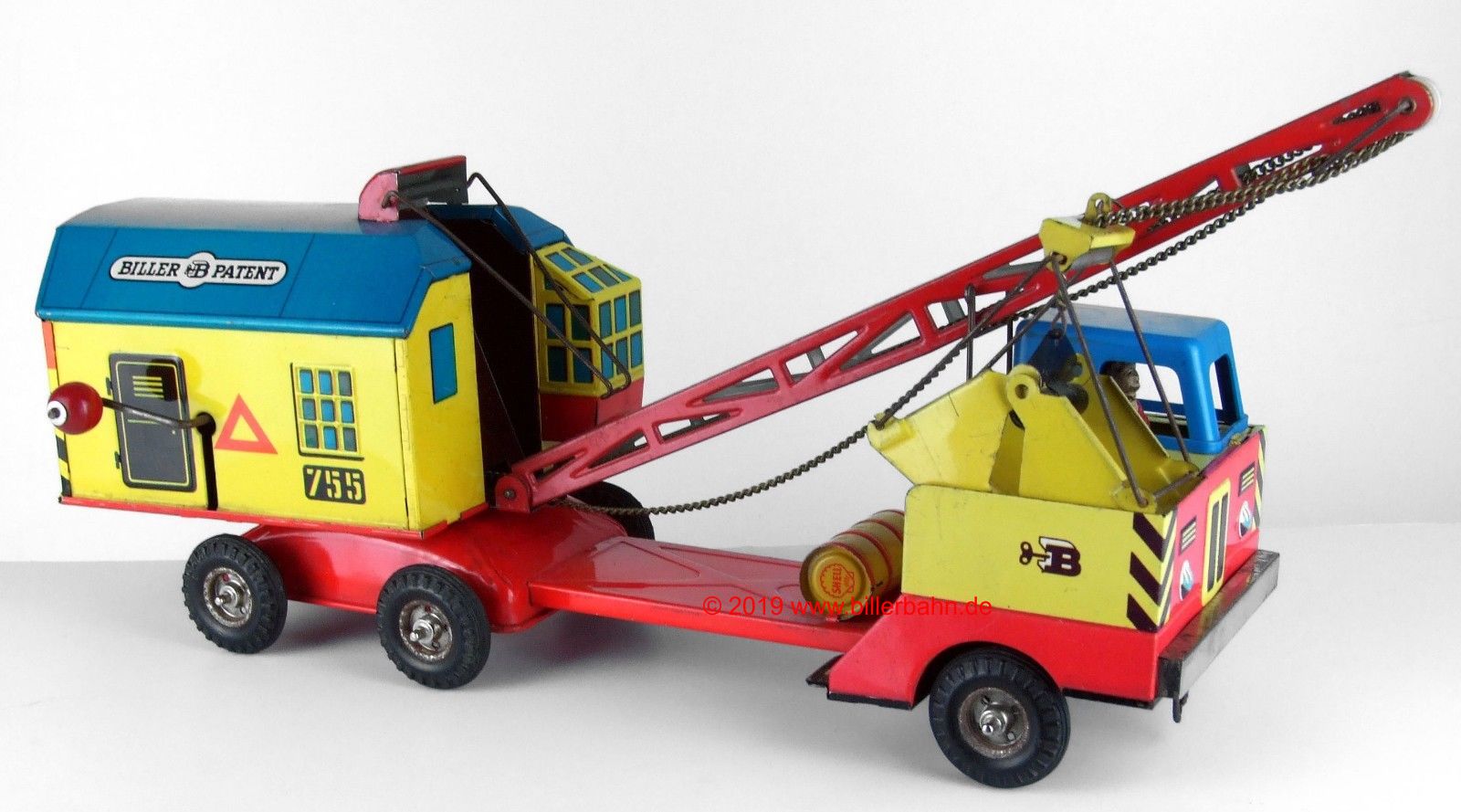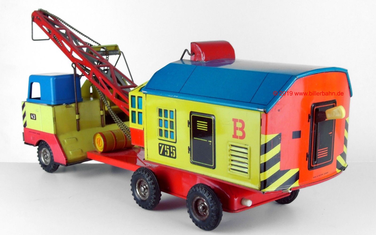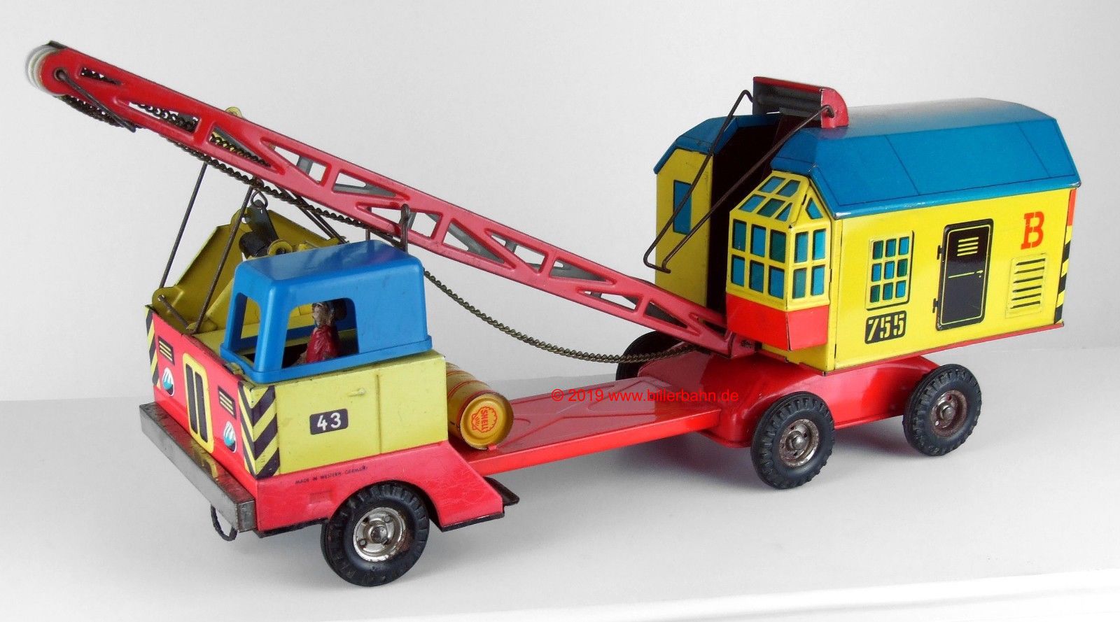845 - dreiachsiger LKW mit Baggeraufbau vom 745 - 1. Der Kran wurde mittels Uhrwerk betrieben, der LKW hatte keinen Antrieb - musste also gezogen oder geschoben werden. Das Fahrerhaus des LKW war "halbiert", so dass die Schaufel in Fahrtrichtung rechts abgelegt werden konnte. Hinter der Kabine befindet sich eine Auslegerstütze, auf die der Ausleger platziert wurde. Auf dem Fahrerhaus war eine rotes Blinklicht angebracht, welches von einer Batterie gespeist wurde. Das Fahrgestell des LKW war Orange/ Rot, das Fahrerhaus, hinter dem ein Ölfass (wie beim Wagen 503) liegt, entweder Blau, Gelb oder Orange. Ob es diesen LKW auch ohne Blinklicht auf der Kabine als 845 gegeben hat, ist mir momentan noch nicht bekannt. Die hier verwendete Nummerierung habe ich aus der Preisliste 1959/60 und dem Spezialitätenkatalog 1960 abgeleitet. Und hier hat der blaue Bagger auch ein rotes Chassis. Dieser Bagger-LKW erscheint erstmals 1959 - und wird nicht als Neuheit vorgestellt. Maße: 400 x 135 x 160 mm |