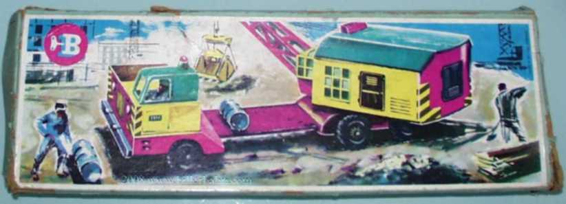 | wie zuvor beschrieben, jedoch hat der Kran jetzt anstelle des Uhrwerkantriebes einen Handkurbelantrieb. Die Handkurbel befindet sich auf der rechten Seite des Krans. Die Fahrerkabine des LKW hatte kein Blinklicht. Der zu sehende Karton gehört zu einem Baggerfahrzeug der 860er-Serie. Dieser Bagger-LKW erscheint erstmals 1959 - und wird nicht als Neuheit vorgestellt. | |||