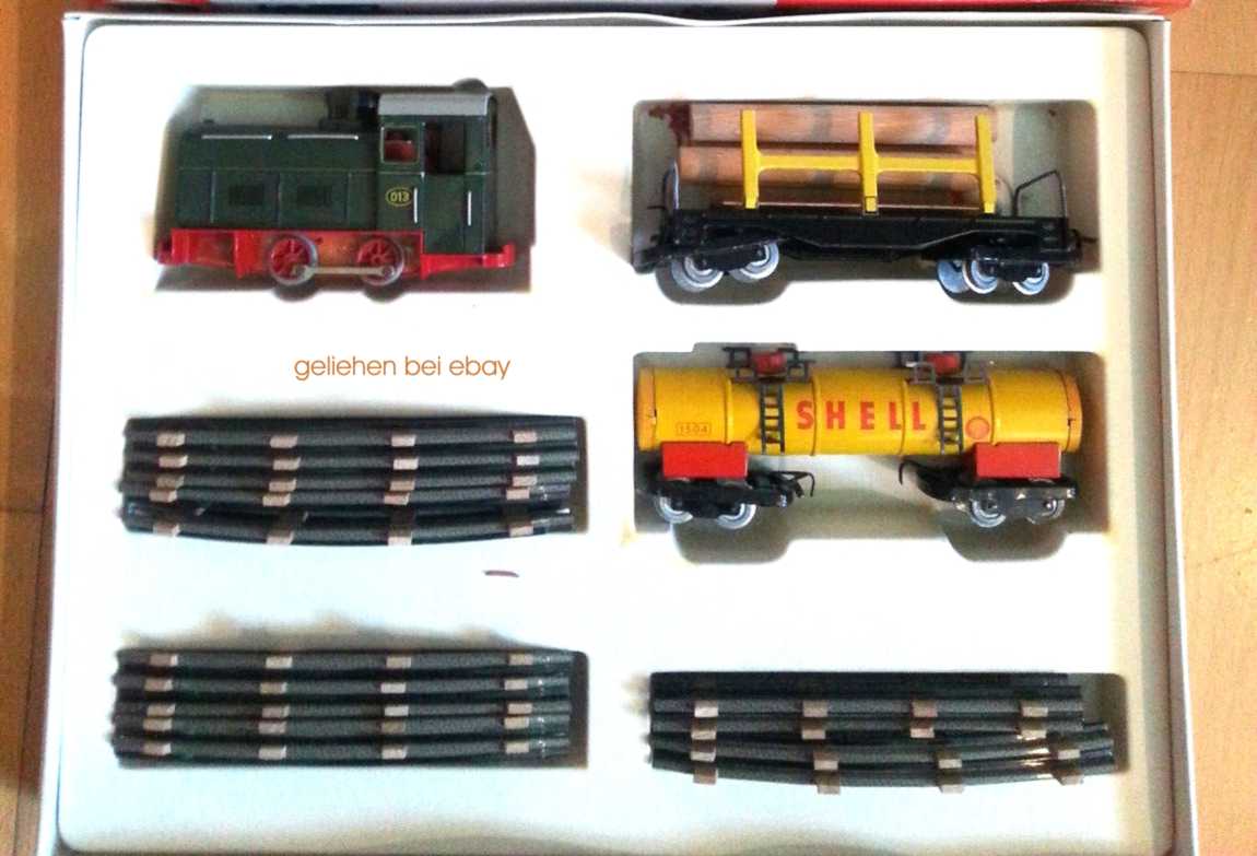 Uhrwerk Version 2 x 002 gerades Gleis, 12 x 009 gebogenes Gleis, 1 x 013 Diesellok, 1 x 510 Rungenwagen schwarz, 1 x 513 Shell Tankwagen. Dem "Muster" nach wieder eine Zusammenstellung aus den "letzten Zügen" mit dem letzten bekannten Deckelbild |